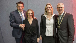 Bundestagsabgeorndeter Olav Gutting (r.), Claudia Grünwald und ihrem Ehemann Bürgermeister Uwe Grempels beim Empfang. Bild: Gans