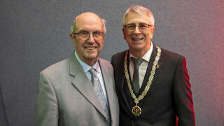 Auch der Vor-Voramtsvorgänger Ewald Hestermann (links) zählte zu den Ehrengästen und wurde von Uwe Grempels herzlich begrüßt. Bild: Gans