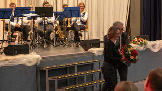 Bürgermeister Uwe Grempels nutzte die Gelegenheit, um sich auch bei seiner Frau Claudia Gründwald mit Blumen zu bedanken. Bild: Gans