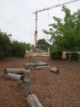 Vom Spielplatz aus können die Schüler die Baustelle der neuen Mensa beobachten.