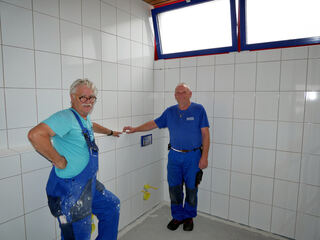 Im Obergeschoss ist der Toilettenumbau weiter fortgeschritten: Günter Bückle (l.) vom gleichnamigen Ketscher Fliesengeschäft und Heinrich Burkhardt vom gleichnamigen Ketscher Sanitärgeschäft haben schon einiges geschafft.