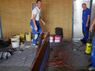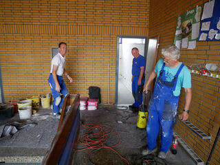 Im Obergeschoss ist der Toilettenumbau weiter fortgeschritten: Günter Bückle (r.) vom gleichnamigen Ketscher Fliesengeschäft und Heinrich Burkhardt (M.) vom gleichnamigen Ketscher Sanitärgeschäft sind mit einem Kollegen am Arbeiten.
