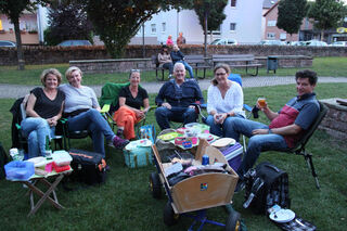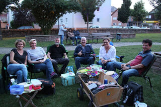 Bereit für's Kino! Dagmar Moles (v.l.), Marion Haas, Rüdiger Geiss, Dave Moles, Michaela Wider, Christian Elleser haben sich ein gemütliches Picknick angerichtet und genießen den Abend.