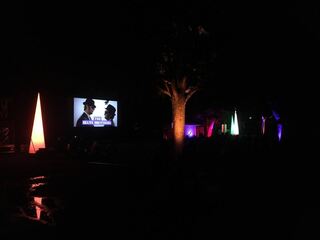 Während die Band noch die Zeit bis zum Film überbrückt, macht sich das Publikum gemütlich. Die große Kino-Leinwand steht links schon bereit.