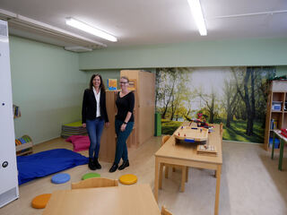 Isabel Heider (l., Sachgebietsleiterin Schule bei der Gemeinde) und Bauamtsleiterin Susanne Barisch in einem der modernen Räume der außerschulischen Betreuung an der Friedrich-Ebert-Schule.