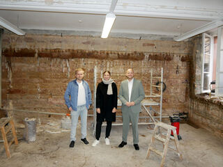 Schulleiter Sascha Barembruch (v. l.), die stellvertretende Bauamtsleiterin Christina Haber-Ressel und Bürgermeister Pascal Seidel im betroffenen Keller der FES: Mit einem speziellen Verfahren wird die nasse Wand trockengelegt, bevor der Raum für den Schulserver umgebaut werden kann.