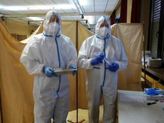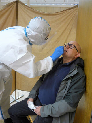 An den einzelnen Stationen im Josefshaus warten immner zwei DRK-Helfer, um die jeweiligen Personen auf das Coronavirus zu testen.
