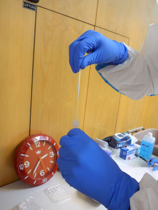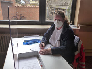 Jutta Gerstel-Gashi nimmt die ausgefüllten Bescheinigungen und die Selbstauskunft der Testpersonen entgegen.