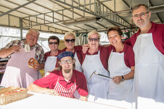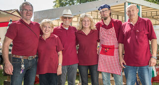 Ein Team des Schnitzel- und Wurststandes: Roland Munk (v. l.), Margot Seidel, Sonja Bechtel, Elke Zimmermann, Brigitte Wiesner, Georg Jährling und im Vordergrund Michael Mädel.