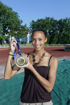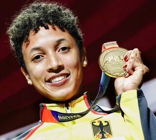 Malaika Mihambo strahlt bei der Leichtathletik-WM 2019 in Doha mit ihrer Goldmedaille um die Wette.