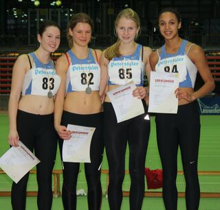 LG Kurpfalz, weibliche B-Jugend: Siegerehrung bei Süddeutschen Meisterschaften, 2. Platz 4 x 200m, Halle; Eileen Dudda (v.li.), Chantal Berg, Leonie Rabe, Malaika Mihambo.