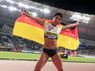 Sie könnte die Welt umarmen: Malaika Mihambo jubelt mit einer deutschen Fahne über ihren Sieg bei der Leichtathletik-WM 2019. Später tanzt sie sogar auf dem Podium.