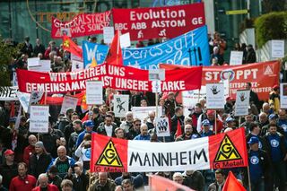 epa05249759 Demonstrators of the European Alstom staff gathering walk to the company headquarter at La Defense in Paris, France, 08 April 2016. The gathering takes place as Alstom-GE announced the reduction of 6500 jobs. EPA/ETIENNE LAURENT +++(c) dpa - Bildfunk+++