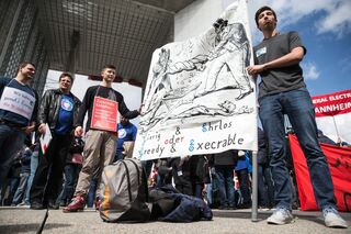 epa05249571 Demonstrators hold a banner stating 'Gierig und Ehrlos oder Greedy and Execrable' during a protest next to Alstom headquarter as a European Alstom staff gathering at La Defense in Paris, France, 08 April 2016. This gathering takes place as Alstom-GE announced the reduction of 6500 jobs. EPA/ETIENNE LAURENT +++(c) dpa - Bildfunk+++