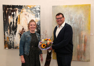 Alexandra Ulrich erhält von Bürgermeister Nils Drescher vor den Kunstwerken „Wonder“ und „Follow the Sun“ einen Blumenstrauß.