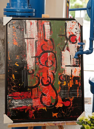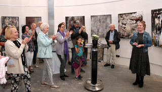 Zur Vernissage sind viele Kunstinteressierte in den Plankstadter Wasserturm gekommen, um die Werke von Alexandra Ulrich (r.) zu sehen und mit der Künstlerin anzustoßen.