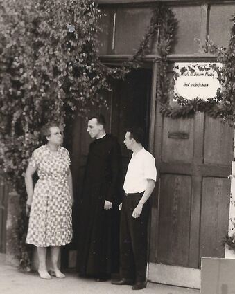 Pater Fidelis zusammen mit Mutter Elisabeth und Bruder Wolfgang vor dem Elternhaus in der Luisenstraße.