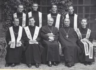 Pfarrer Franz Sessler, Kaplan Fritz Ullmer, Pater Titus, Fidelis Ruppert und Pfarrer Ludwig Bender bei der Primiz in Plankstadt.
