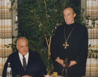 Bundeskanzler Helmut Kohl zusammen mit Abt Fidelis bei einem seiner vielen Besuch in der Abtei Münsterschwarzach.