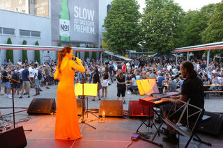 Sängerin Juliana Blumenschein ist "Mutterschaftsersatz" für Jutta Gückel. Mit Timbre und Leidenschaft singt sie sich quer durch Salsaklänge, Tangorhythmen und Co.