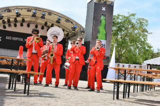 "Brass2Go" - die Männer in Rot - im Weldegarten am Sonntagmorgen.