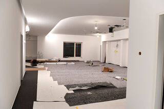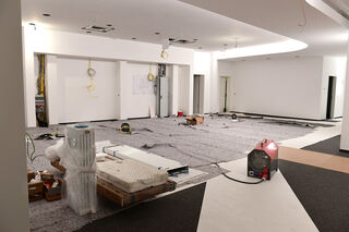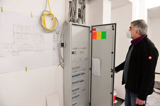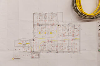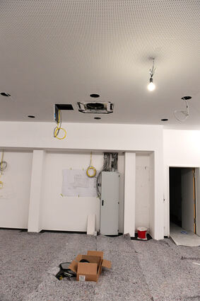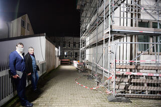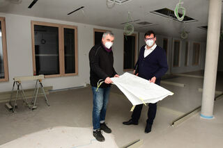 Andreas Ernst (links) und Nils Drescher schauen sich in der künftigen Kämmerei den Bauplan an.