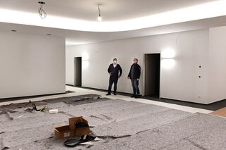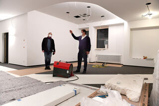 Andreas Ernst (links) und Nils Drescher schauen sich das künftige Bürgerbüro an.