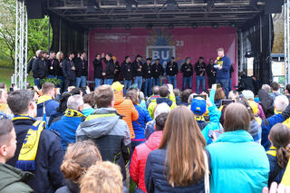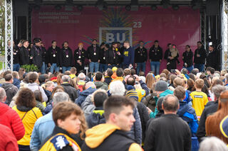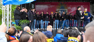 Mit ihrem Fans feiern die Löwen-Spieler am Montagabend auf der Bundesgartenschau im Luisenpark den Pokalerfolg.