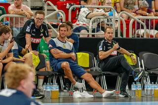 Löwen-Legende Uwe Gensheimer sitzt am Spielfeldrand und beobachtet das Spiel.