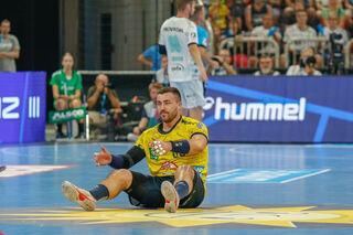 Kreisläufer Jannik Kohlbacher sitzt auf dem Boden.