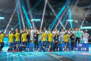 Siegerehrung: Die Spieler der Rhein-Neckar Löwen gratulieren den Kielern zum Sieg im DHB-Supercup.