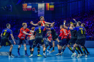 Rhein Neckar Loewe Niclas Kirkelokke (Nr.6) mit dem Ball beim Spiel in der EHF European League, HBC Nantes - Rhein Neckar Loewen.