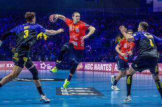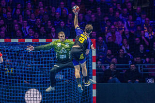 Rhein Neckar Loewe Olle Forsell Schefvert (Nr.25) am Ball beim Spiel in der EHF European League, HBC Nantes - Rhein Neckar Loewen.