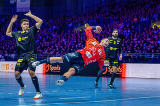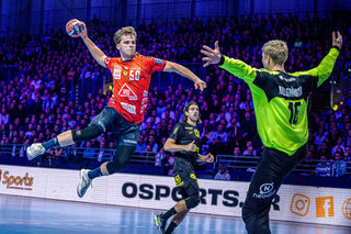Rhein Neckar Loewe Jannik Kohlbacher (Nr.80) beim Wurf beim Spiel in der EHF European League, HBC Nantes - Rhein Neckar Loewen.