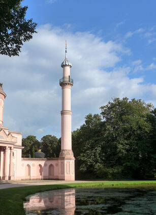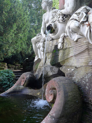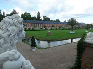 Blick auf die Orangerie. Das Wasser fließt wie überall im Schlossgarten.