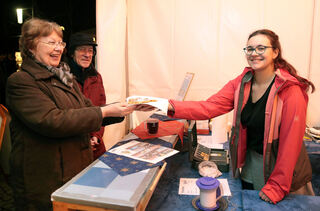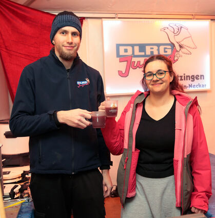 Jan Müller und Lisa Eilbrecht bedienen am Stand der DLRG die Kunden.