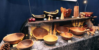 Schöne Arbeiten: handgedrechselte Holzschalen und -vasen sowie Kreisel.