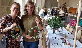Katrin Mayer (hier mit Katharina Kittlitz) bietet das erste Mal auf dem Designmarkt "Handmade Love" Workshops an. Sie zeigt, wie man angesagte Kränze aus Eukalyptus fertigt.