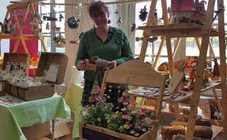 Kunsthandwerk aus dem Schwarzwald: Birgit Kronenbittner ("Frelmati") aus Schramberg hat schöne Wohn- und Gartenaccessoires aus Holz und Keramik, Vogeltränken, Baumschubladen sowie handgefertigte Keramikknöpfe und mehr nach Schwetzingen mitgebracht.