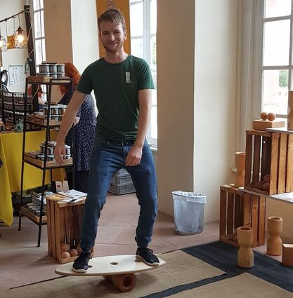 Patrick Kaiser von "Rollholz" (rollholz.com) demonstriert ein "Surfbrett" aus Holz für Balanceübungen und die Körperstabilisierung. Es gibt auch (am Boden stehend) Rollholz für Faszientraining. Nachhaltigkeit, Optik und Beschaffenheit sowie Eigenschaften (Wärme, Langlebigkeit, pfflegeleicht) machen die Produkte aus.