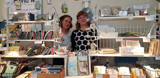 "mona w." (www.instagram.com/naehereien) alias Monika Wintermantel (r., mit Margot Schlude) hat sich auf Upcycling aus Stoff und Papier spezialisiert. Hier sieht man, was aus alten Zeitung allen noch entstehen kann - zum Beispiel Lichterketten.