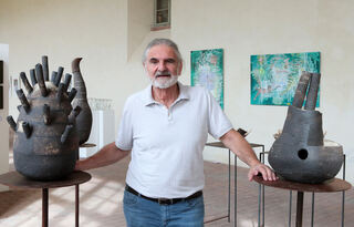 Der Künstler Tom Feritsch zwischen seinen Skulpturen "Gefäßform I" und "Gefäßform II".