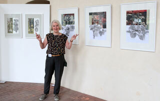 Die Künstlerin Felicitas Wiest vor den Kunstwerken "Verwandlung" 1, 2 und "entwickeln" 1 - 3".