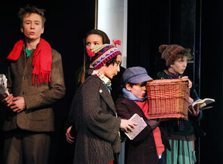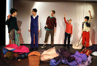 Prosper (Felix Rieseberg), Wespe (Lara Krahlisch), Mosca (Tunay Tuncali), Bo (Simon Speer) und Riccio (Maximilian di Salvo) tragen den Korb mit der Brieftaube.