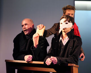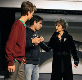 Intendant und Regisseur Joerg Steve Mohr (Mitte) erklärt Prosper (Felix Rieseberg, l.) und Riccio (Maximilian di Salvo) eine Szene.