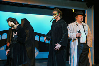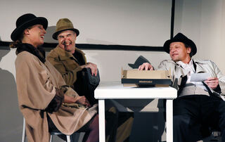 Klaus Herdel (Mitte) sorgte als Max Hartlieb zusammen mit Sandra Lühr als überkandidelte Tante Ester für die komödiantischen Momente im Stück. Hier im Gespräch mit Privatdetektiv Victor Getz (Johannes Szilvassy, r.).