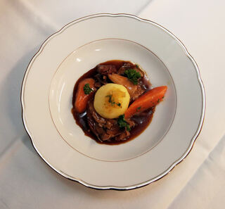 Hauptgang: Geschmorter Hase mit Kartoffelklößchen.