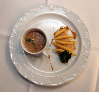Vorspeisen: Geröstete Weckmehlsuppe, Schupfnudeln mit gedämpftem Weißkraut.