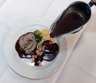 Hauptgänge: Altdeutscher Sauerbraten mit Butterspätzle, Kalbsnierenbraten mit Rosenkohl.