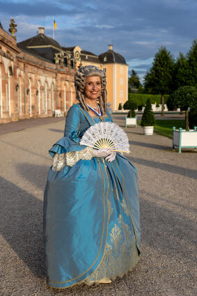 Die Kurfürstin von der CDK Mannheim Viktoria Luise possiert im Schwetzinger Schlossgarten.